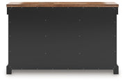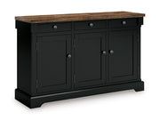 Raise the bar on modern farmhouse style with this dining buffet. Its handsome good looks are accentuated with a two-tone finish and a casual butcher block veneer top. The sturdy silhouette adds a hearty element, whether your style is vintage, country or eclectic. Three drawers and three cabinets with adjustable shelves serve your entertaining needs well.